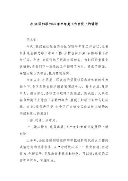 / 【七哥公文】2025年:在XX区妇联2025年半年度工作会议上的讲话+更多免费公文+VX:QiGeGongWen2024
