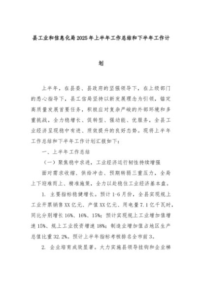 【七哥公文】2025年:县工业和信息化局2025年上半年工作总结和下半年工作计划+更多免费公文+VX:QiGeGongWen2024