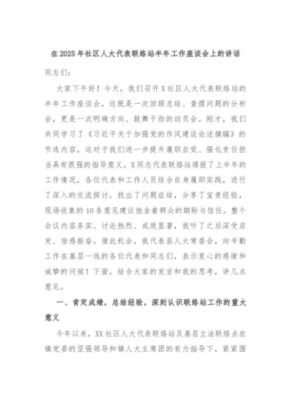 【七哥公文】2025年:在2025年社区人大代表联络站半年工作座谈会上的讲话+更多免费公文+VX:QiGeGongWen2024