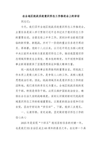 / 【七哥公文】2025年:在全地区统战系统意识形态工作推进会上的讲话+更多免费公文+VX:QiGeGongWen2024