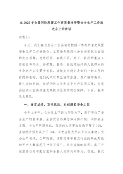 【七哥公文】2025年:在2025年全县消防救援工作高质量发展暨安全生产工作推进会上的讲话+更多免费公文+VX:QiGeGongWen2024