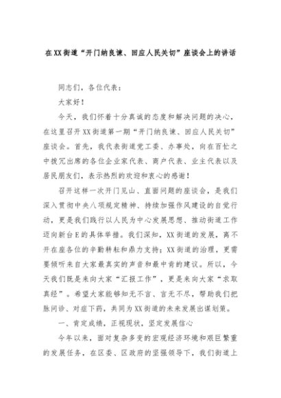【七哥公文】2025年:在XX街道“开门纳良谏、回应人民关切”座谈会上的讲话+更多免费公文+VX:QiGeGongWen2024