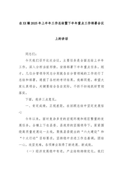 【七哥公文】2025年:在XX镇2025年上半年工作总结暨下半年重点工作部署会议上的讲话+更多免费公文+VX:QiGeGongWen2024
