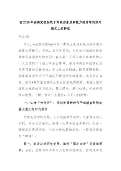 【七哥公文】2025年:在2025年县委党校科级干部政治素质和能力提升培训班开班式上的讲话+更多免费公文+VX:QiGeGongWen2024