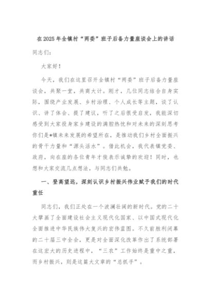 【七哥公文】2025年:在2025年全镇村“两委”班子后备力量座谈会上的讲话+更多免费公文+VX:QiGeGongWen2024