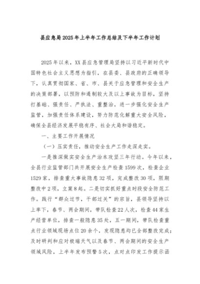 / 【七哥公文】2025年:县应急局2025年上半年工作总结及下半年工作计划+更多免费公文+VX:QiGeGongWen2024