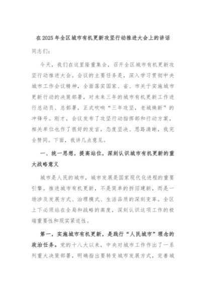 【七哥公文】2025年:在2025年全区城市有机更新攻坚行动推进大会上的讲话+更多免费公文+VX:QiGeGongWen2024