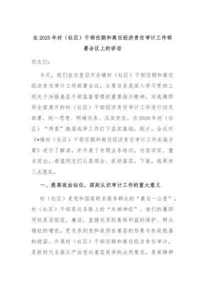 【七哥公文】2025年:在2025年村(社区)干部任期和离任经济责任审计工作部署会议上的讲话+更多免费公文+VX:QiGeGongWen2024