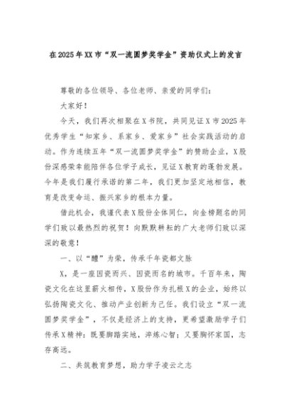 【七哥公文】2025年:在2025年XX市“双一流圆梦奖学金”资助仪式上的发言+更多免费公文+VX:QiGeGongWen2024