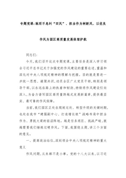【七哥公文】2025年:专题党课:驰而不息纠“四风”、担当作为树新风、以优良作风为园区高质量发展保驾护航+更多免费公文+VX:QiGeGongWen2024