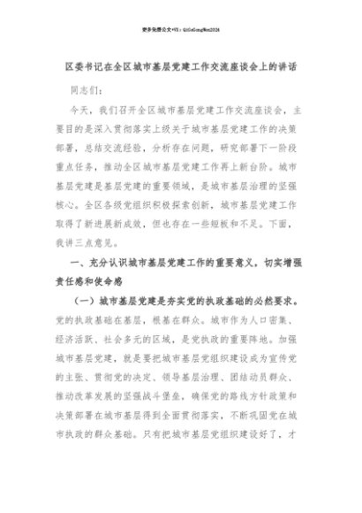 【七哥公文】2025年:【七哥公文】区委书记在全区城市基层党建工作交流座谈会上的讲话+更多免费公文+VX:QiGeGongWen2024+更多免费公文+VX:QiGeGongWen2024