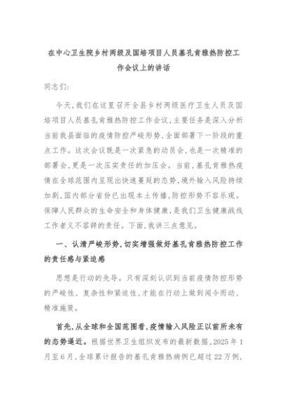 【七哥公文】2025年:在中心卫生院乡村两级及国培项目人员基孔肯雅热防控工作会议上的讲话+更多免费公文+VX:QiGeGongWen2024
