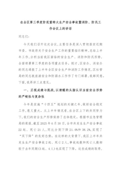 【七哥公文】2025年:在全区第三季度防范重特大生产安全事故暨消防、防汛工作会议上的讲话+更多免费公文+VX:QiGeGongWen2024
