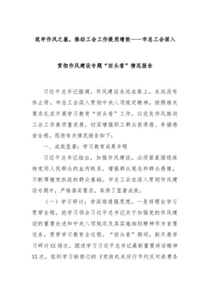 【七哥公文】2025年:筑牢作风之基,推动工会工作提质增效——市总工会深入贯彻作风建设专题“回头看”情况报告+更多免费公文+VX:QiGeGongWen2024