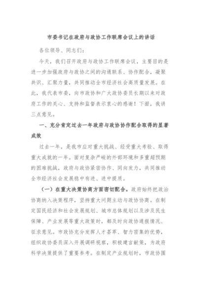 【七哥公文】2025年:市委书记在政府与政协工作联席会议上的讲话+更多免费公文+VX:QiGeGongWen2024