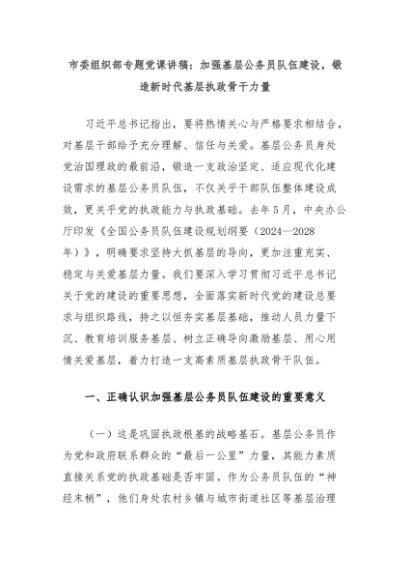 【七哥公文】2025年:市委组织部专题党课讲稿:加强基层公务员队伍建设,锻造新时代基层执政骨干力量+更多免费公文+VX:QiGeGongWen2024