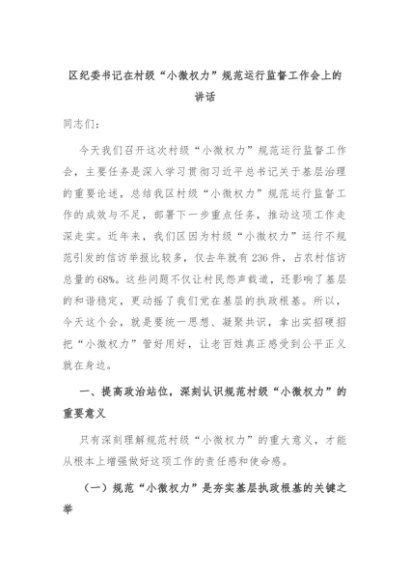 【七哥公文】2025年:区纪委书记在村级“小微权力”规范运行监督工作会上的讲话+更多免费公文+VX:QiGeGongWen2024