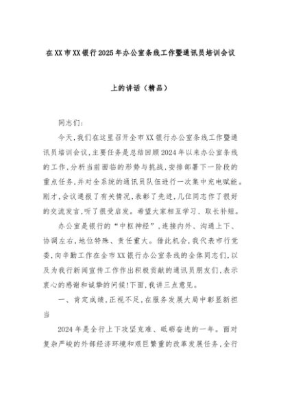 【七哥公文】2025年:在XX市XX银行2025年办公室条线工作暨通讯员培训会议上的讲话(精品)+更多免费公文+VX:QiGeGongWen2024