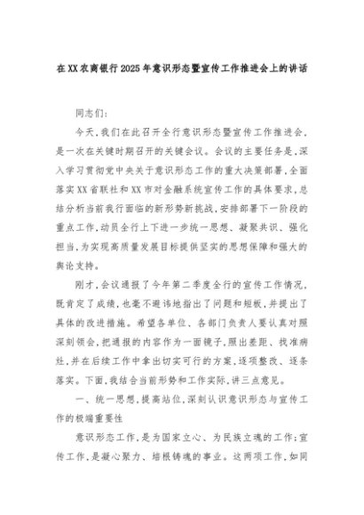 【七哥公文】2025年:在XX农商银行2025年意识形态暨宣传工作推进会上的讲话+更多免费公文+VX:QiGeGongWen2024