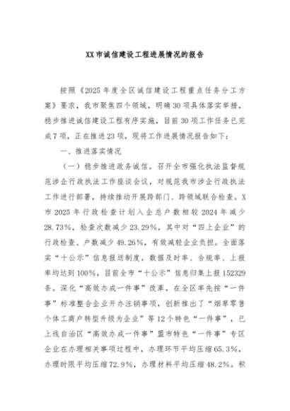 / 【七哥公文】2025年:XX市诚信建设工程进展情况的报告+更多免费公文+VX:QiGeGongWen2024