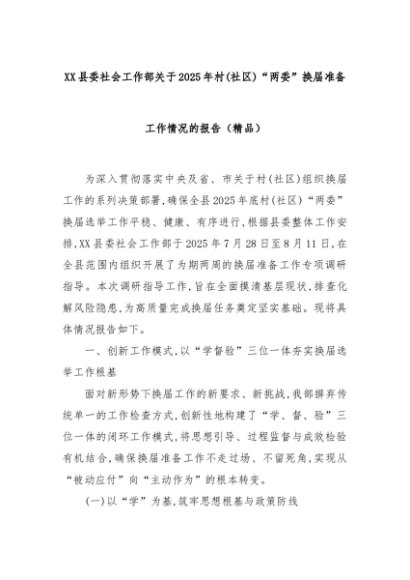 【七哥公文】2025年:XX县委社会工作部关于2025年村(社区)“两委”换届准备工作情况的报告(精品)+更多免费公文+VX:QiGeGongWen2024