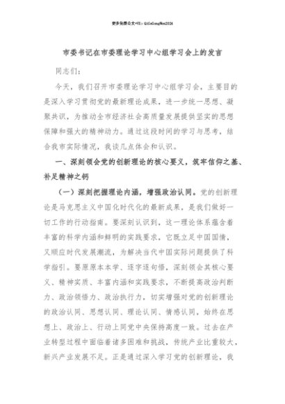 【七哥公文】2025年:【七哥公文】市委书记在市委理论学习中心组学习会上的发言+更多免费公文+VX:QiGeGongWen2024+更多免费公文+VX:QiGeGongWen2024