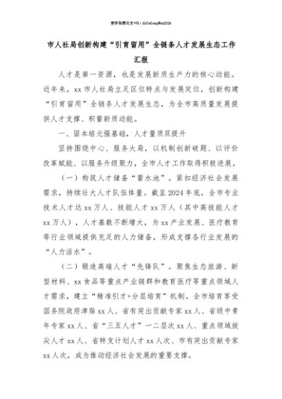 【七哥公文】2025年:【七哥公文】市人社局创新构建“引育留用”全链条人才发展生态工作汇报+更多免费公文+VX:QiGeGongWen2024+更多免费公文+VX:QiGeGongWen2024