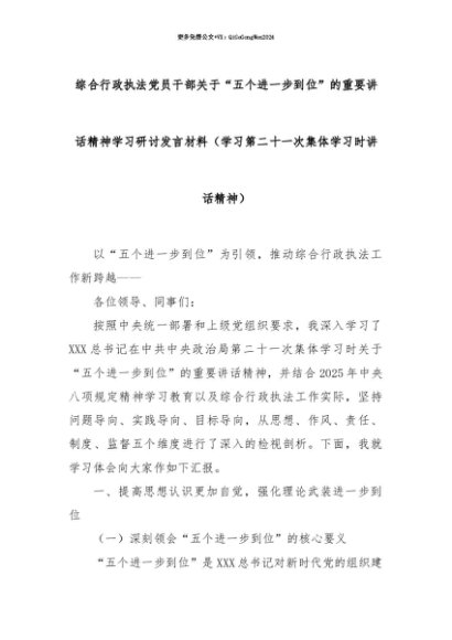 【七哥公文】2025年:【七哥公文】综合行政执法党员干部关于“五个进一步到位”的重要讲话精神学习研讨发言材料(学习第二十一次集体学习时讲话精神)_副本+更多免费公文+VX:QiGeGongWen2024+更多免费公文+VX:QiGeGongWen2024