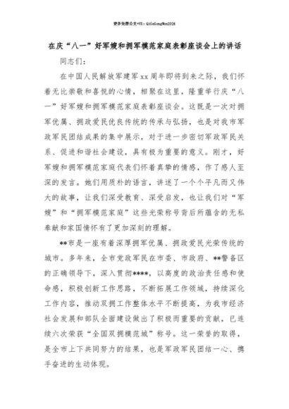 【七哥公文】2025年:【七哥公文】在庆“八一”好军嫂和拥军模范家庭表彰座谈会上的讲话+更多免费公文+VX:QiGeGongWen2024+更多免费公文+VX:QiGeGongWen2024