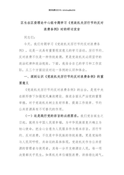 【七哥公文】2025年:【七哥公文】区长在区委理论中心组专题学习《党政机关厉行节约反对浪费条例》时的研讨发言+更多免费公文+VX:QiGeGongWen2024+更多免费公文+VX:QiGeGongWen2024