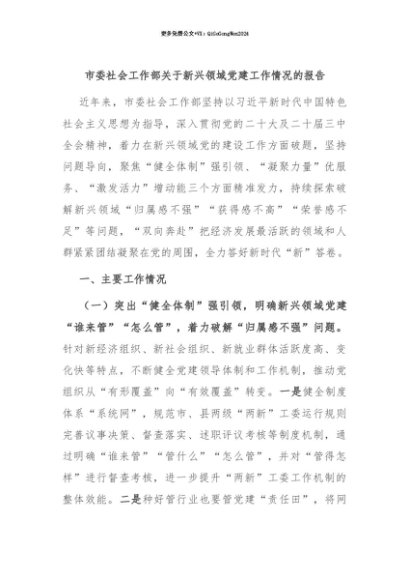【七哥公文】2025年:【七哥公文】市委社会工作部关于新兴领域党建工作情况的报告+更多免费公文+VX:QiGeGongWen2024+更多免费公文+VX:QiGeGongWen2024