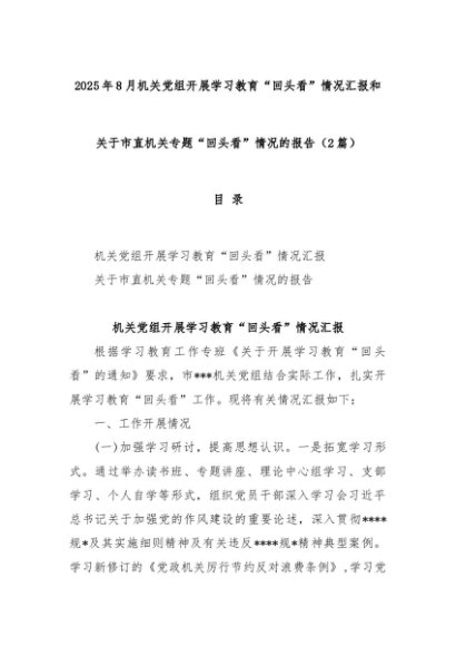 【七哥公文】2025年:(2篇)2025年8月机关党组开展学习教育“回头看”情况汇报和关于市直机关专题“回头看”情况的报告+更多免费公文+VX:QiGeGongWen2024