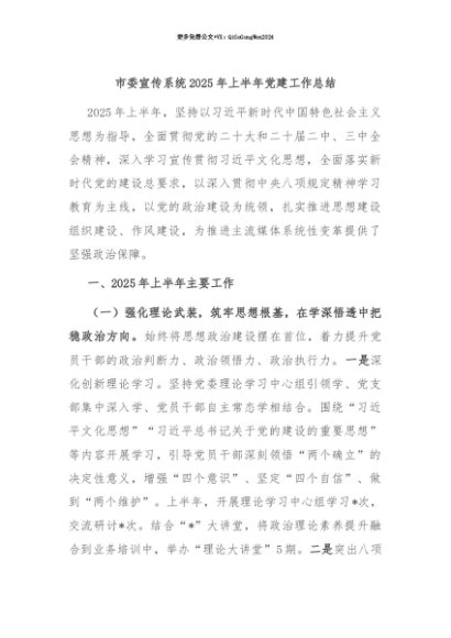 【七哥公文】2025年:【七哥公文】市委宣传系统2025年上半年党建工作总结+更多免费公文+VX:QiGeGongWen2024+更多免费公文+VX:QiGeGongWen2024