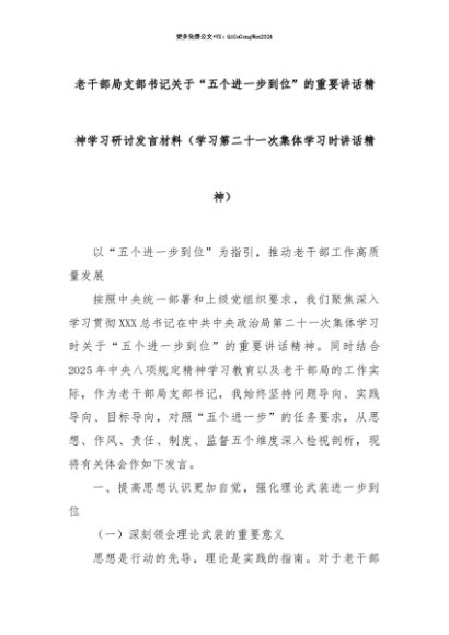 【七哥公文】2025年:【七哥公文】老干部局支部书记关于“五个进一步到位”的重要讲话精神学习研讨发言材料(学习第二十一次集体学习时讲话精神)_副本+更多免费公文+VX:QiGeGongWen2024+更多免费公文+VX:QiGeGongWen2024