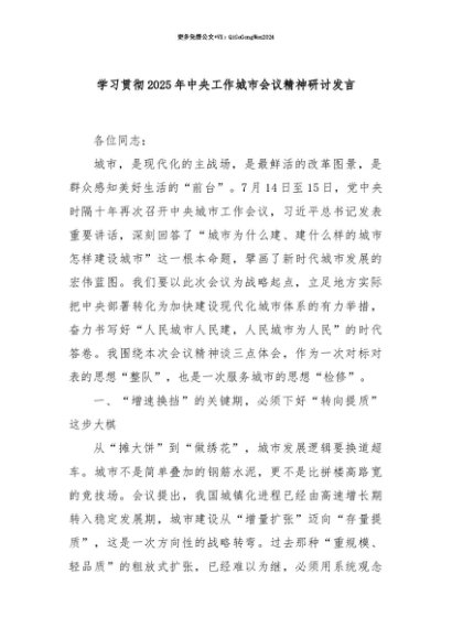 【七哥公文】2025年:【七哥公文】学习贯彻2025年中央工作城市会议精神研讨发言+更多免费公文+VX:QiGeGongWen2024+更多免费公文+VX:QiGeGongWen2024