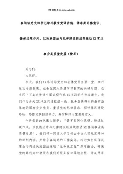 【七哥公文】2025年:【七哥公文】客运站党支部书记学习教育党课讲稿:铸牢共同体意识、锤炼过硬作风、以民族团结与纪律建设新成效推动XX客运事业高质量发展(精品)+更多免费公文+VX:QiGeGongWen2024+更多免费公文+VX:QiGeGongWen2024