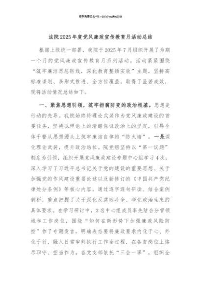 【七哥公文】2025年:【七哥公文】法院2025年度党风廉政宣传教育月活动总结+更多免费公文+VX:QiGeGongWen2024+更多免费公文+VX:QiGeGongWen2024