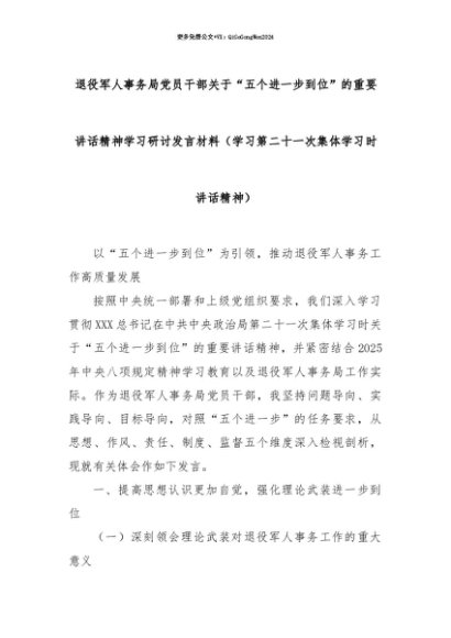 【七哥公文】2025年:【七哥公文】退役军人事务局党员干部关于“五个进一步到位”的重要讲话精神学习研讨发言材料(学习第二十一次集体学习时讲话精神)_副本+更多免费公文+VX:QiGeGongWen2024+更多免费公文+VX:QiGeGongWen2024