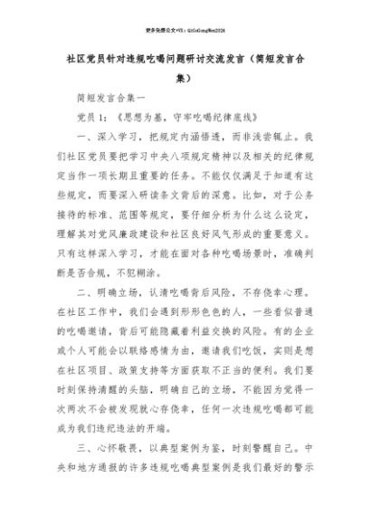 【七哥公文】2025年:【七哥公文】社区党员针对违规吃喝问题研讨交流发言(简短发言合集)+更多免费公文+VX:QiGeGongWen2024+更多免费公文+VX:QiGeGongWen2024