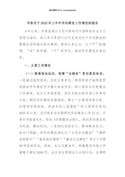 【七哥公文】2025年:【七哥公文】市委关于2025年上半年作风建设工作情况的报告+更多免费公文+VX:QiGeGongWen2024+更多免费公文+VX:QiGeGongWen2024