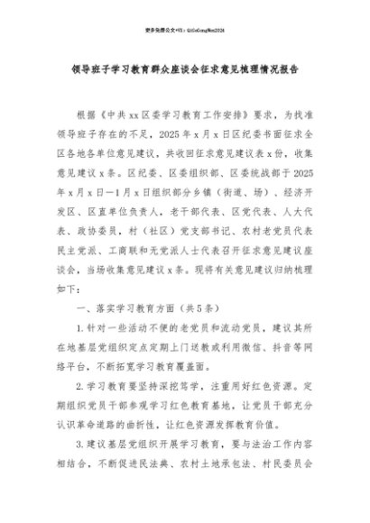【七哥公文】2025年:【七哥公文】领导班子学习教育群众座谈会征求意见梳理情况报告+更多免费公文+VX:QiGeGongWen2024+更多免费公文+VX:QiGeGongWen2024
