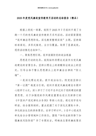 【七哥公文】2025年:【七哥公文】2025年度党风廉政宣传教育月活动的总结报告(精品)+更多免费公文+VX:QiGeGongWen2024+更多免费公文+VX:QiGeGongWen2024