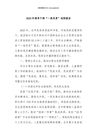 【七哥公文】2025年:【七哥公文】2025年领导干部“一岗双责”述职报告+更多免费公文+VX:QiGeGongWen2024+更多免费公文+VX:QiGeGongWen2024