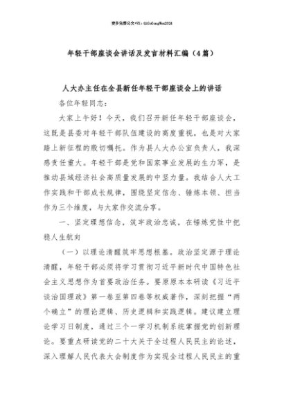 【七哥公文】2025年:【七哥公文】(4篇)年轻干部座谈会讲话及发言材料汇编+更多免费公文+VX:QiGeGongWen2024+更多免费公文+VX:QiGeGongWen2024
