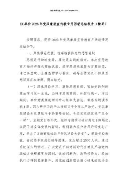 【七哥公文】2025年:【七哥公文】XX单位2025年党风廉政宣传教育月活动总结报告(精品)+更多免费公文+VX:QiGeGongWen2024+更多免费公文+VX:QiGeGongWen2024