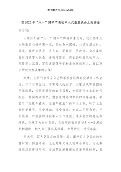 【七哥公文】2025年:【七哥公文】在2025年“八一”建军节退役军人代表座谈会上的讲话+更多免费公文+VX:QiGeGongWen2024+更多免费公文+VX:QiGeGongWen2024