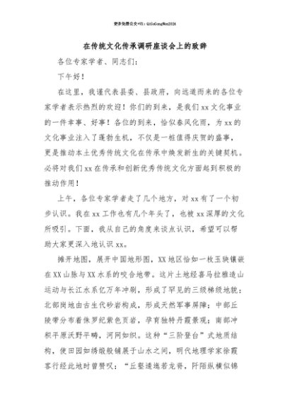【七哥公文】2025年:【七哥公文】在传统文化传承调研座谈会上的致辞+更多免费公文+VX:QiGeGongWen2024+更多免费公文+VX:QiGeGongWen2024