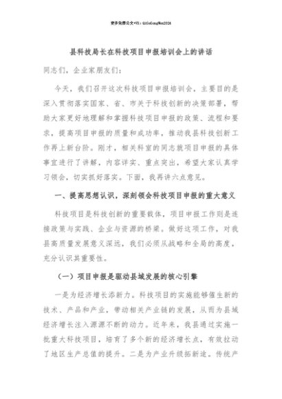 【七哥公文】2025年:【七哥公文】县科技局长在科技项目申报培训会上的讲话+更多免费公文+VX:QiGeGongWen2024+更多免费公文+VX:QiGeGongWen2024
