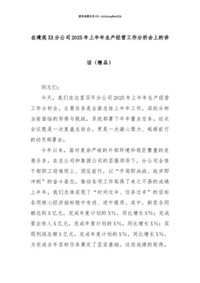 【七哥公文】2025年:【七哥公文】在建筑XX分公司2025年上半年生产经营工作分析会上的讲话(精品)+更多免费公文+VX:QiGeGongWen2024+更多免费公文+VX:QiGeGongWen2024