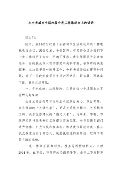 / 【七哥公文】2025年:在全市城市生活垃圾分类工作推进会上的讲话+更多免费公文+VX:QiGeGongWen2024